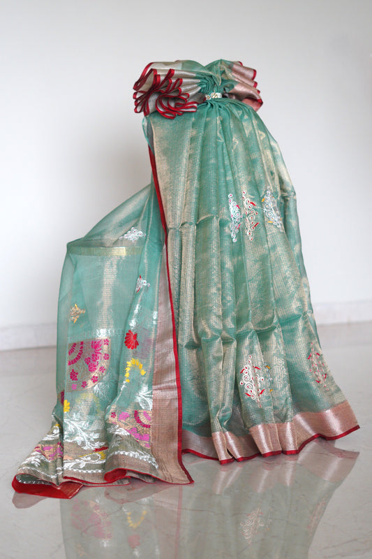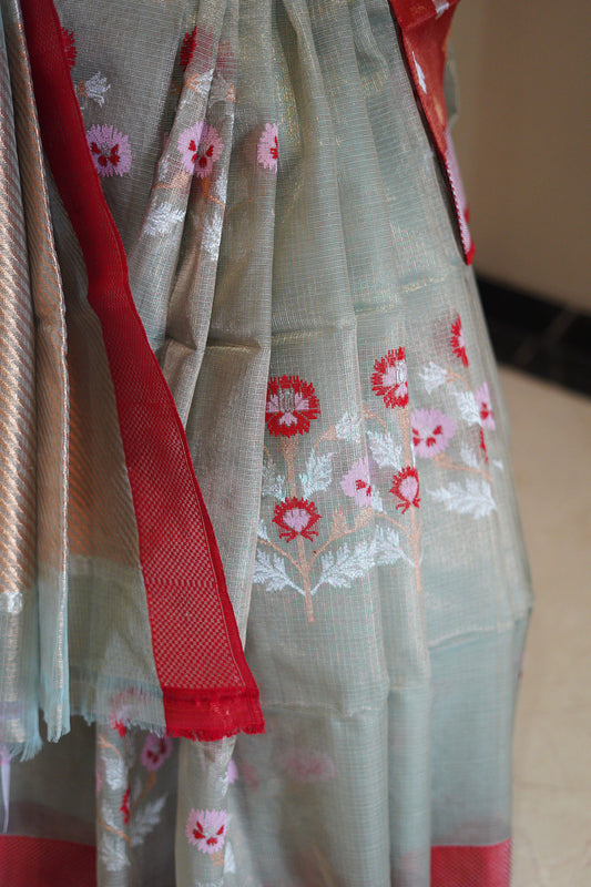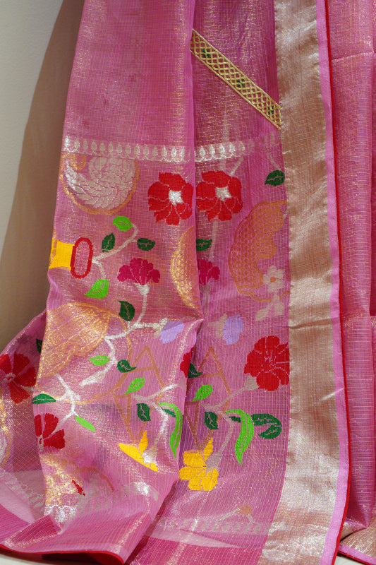 Rose Gold Pink Floral Jaal Saree with Red Salvage