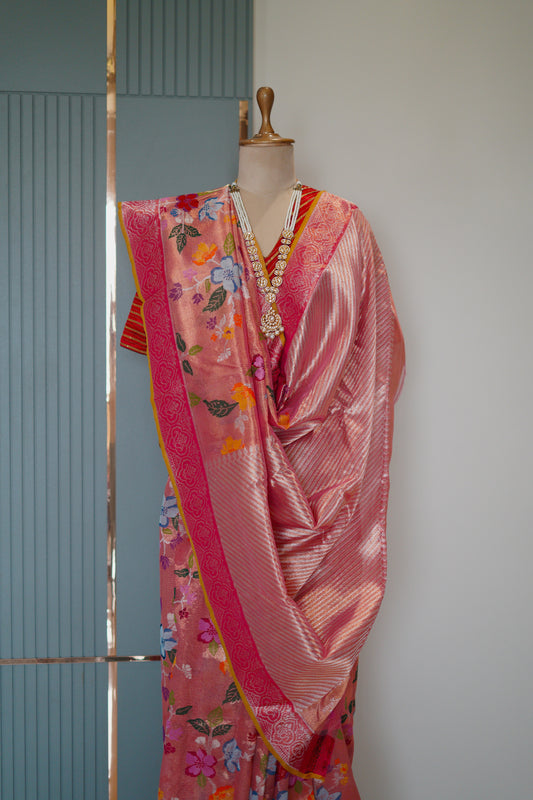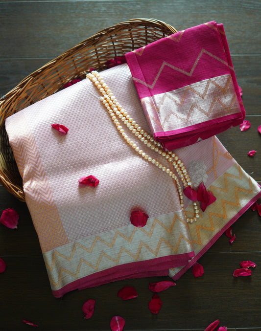 Baby Pink Saree Blooms with Floral Jaal and A Zigzag Border