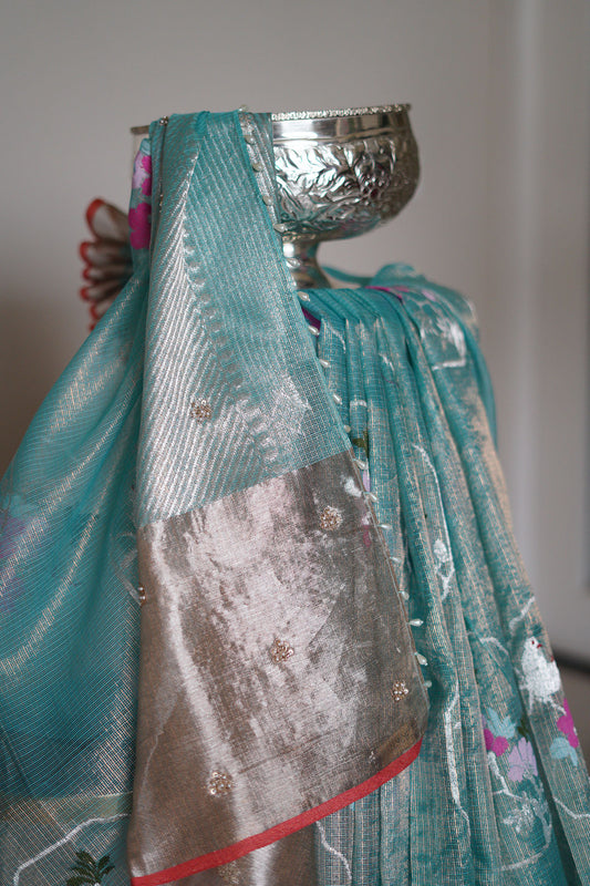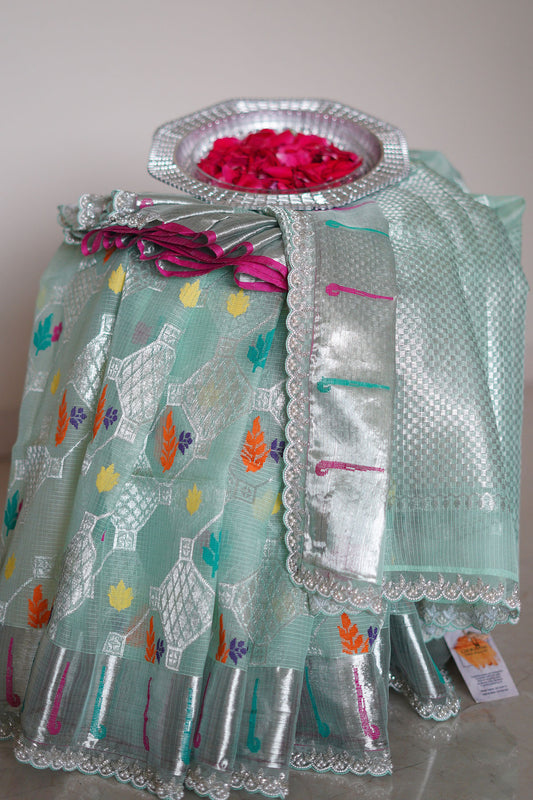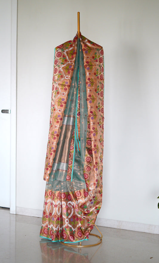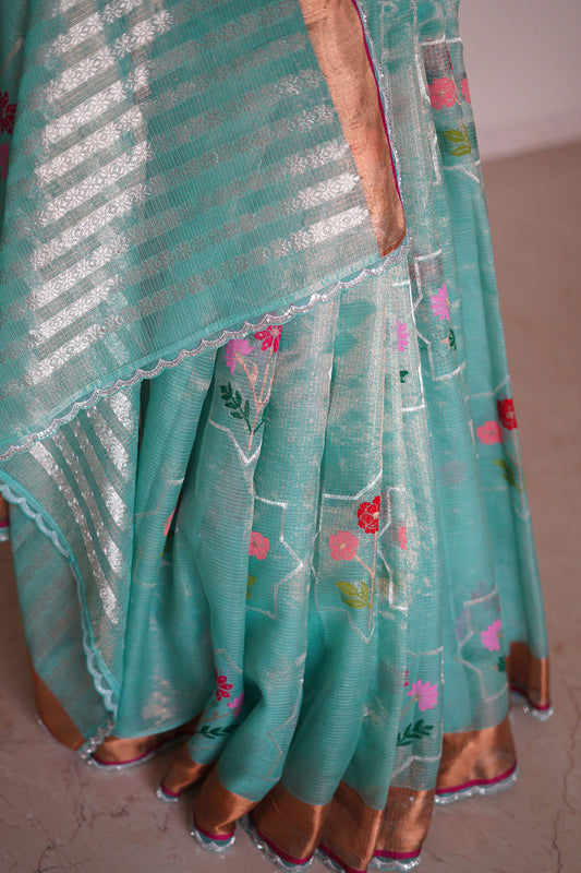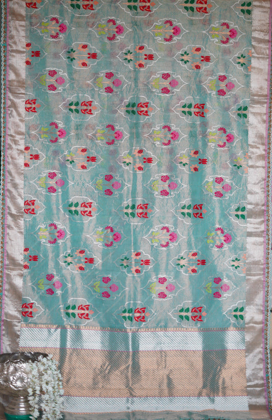 Sea Blue Saree Single Tissue Saree with Floral Mughal Motif and Scallop