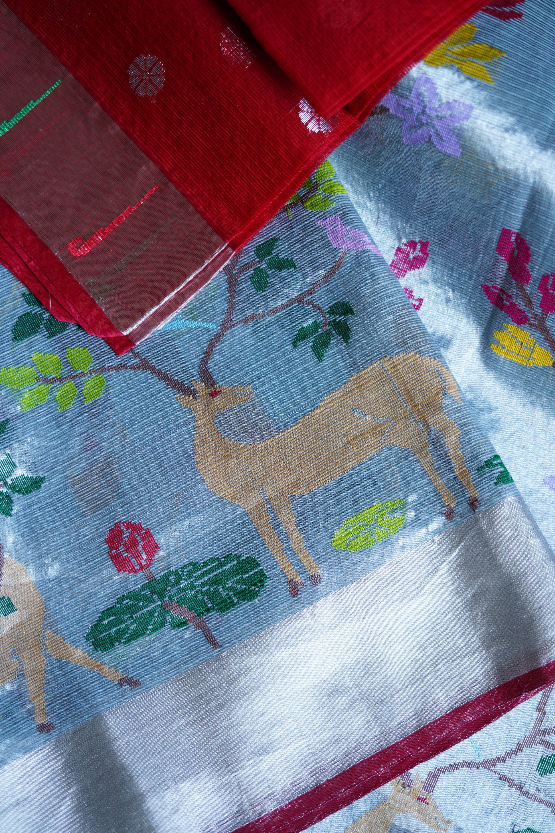Ash blue saree with paithani jaal in a jungle theme with red blouse to add color to the subtle hues