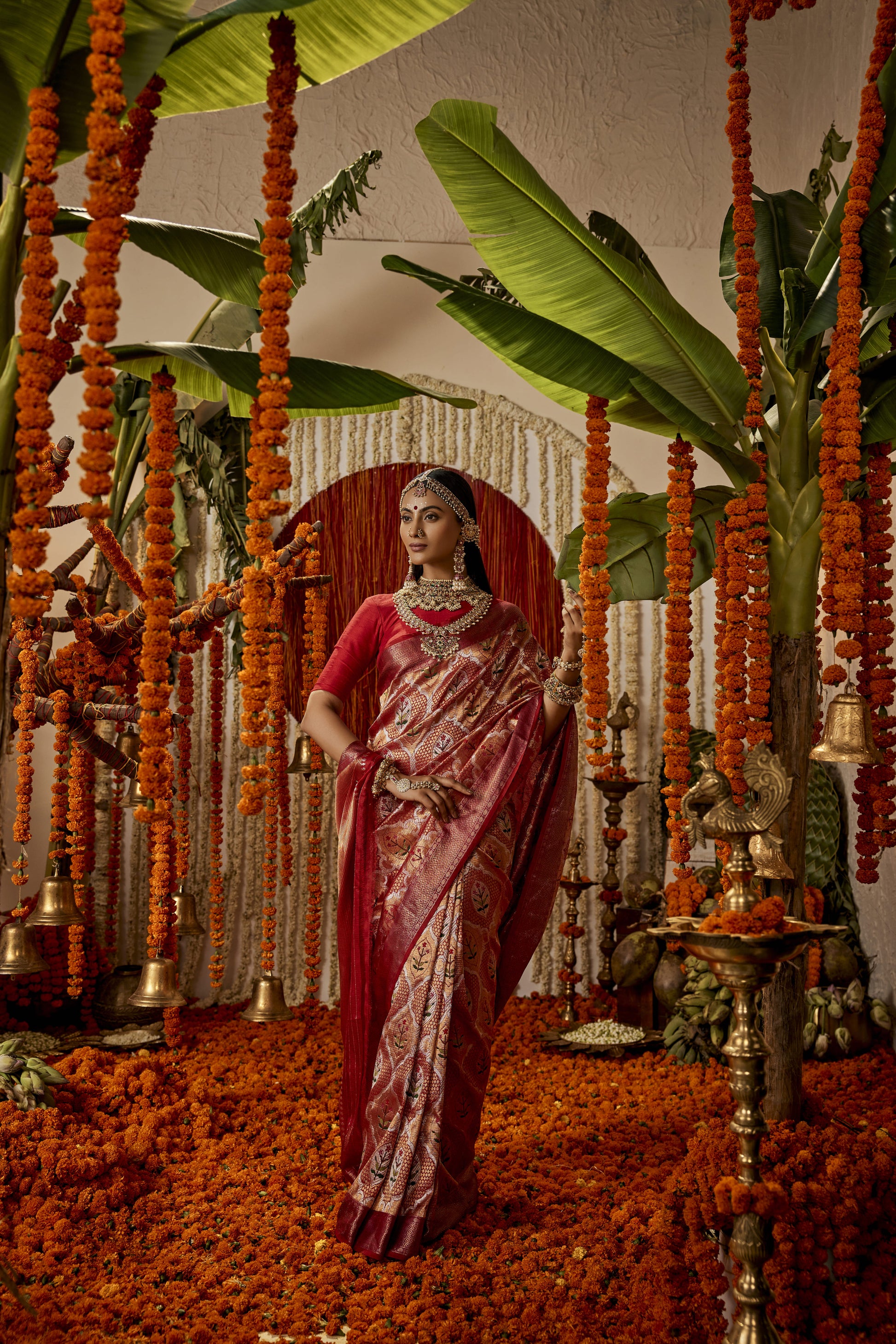 A Gajri pink Saree in Geometrical pattern with Self color minakari enhancing the base