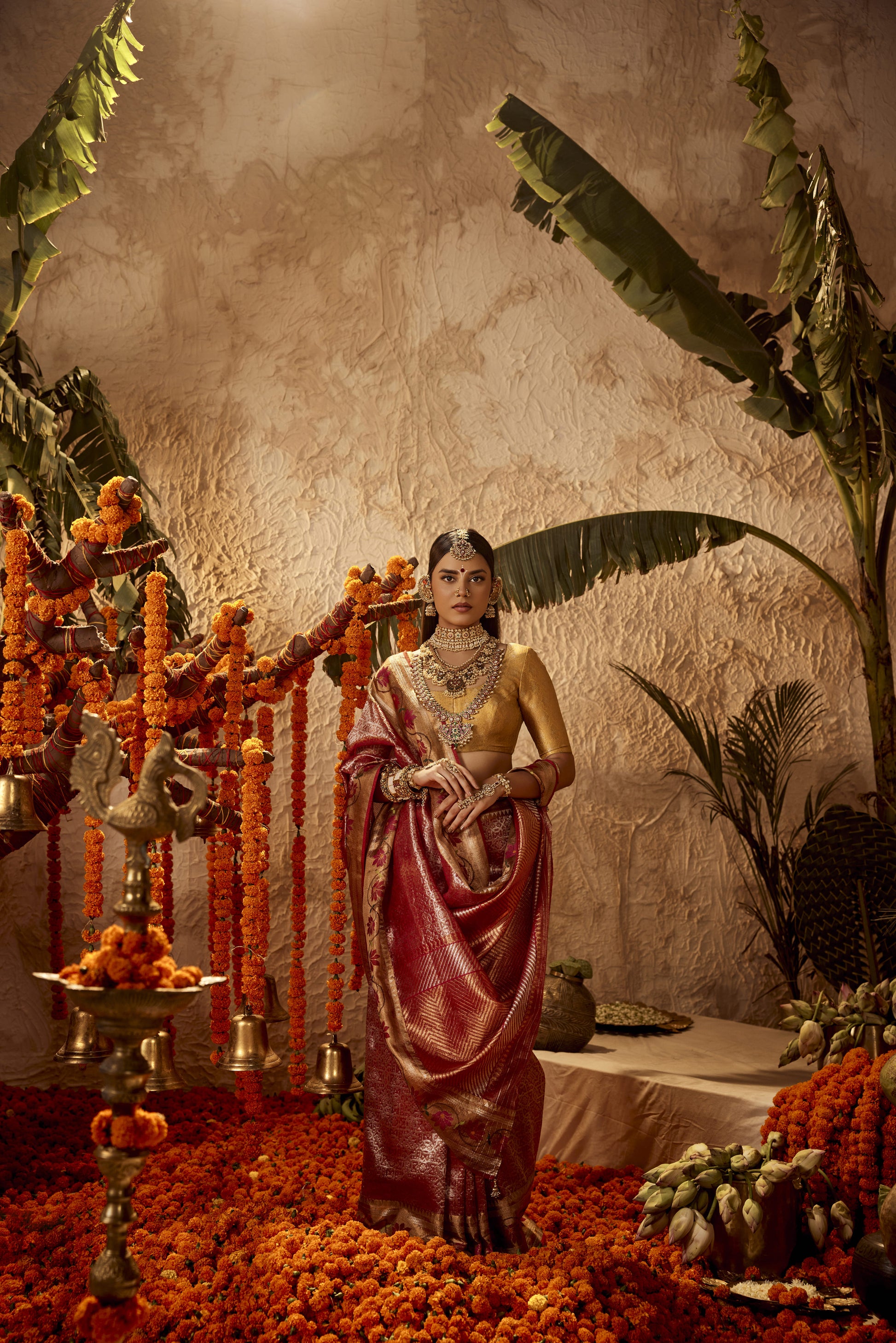 A Sindoori red jaal saree, Border complemented in gold zari and floral motifs. Jamawaar weaver in then body is giving heavy look